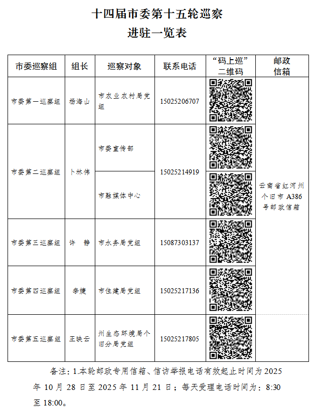 据悉,市委巡察组将在被巡察党组织工作30天左右,巡察期间设专门值班电话、邮政专用信箱,主要受理反映被巡察党组织领导班子及其成员、下一级党组织主要负责人和重点岗位人员问题的来信来电来访,重点是关于违反政治纪律、组织纪律、廉洁纪律、群众纪律、工作纪律和生活纪律等方面的举报和反映。市委巡察组受理信访时间截止到2025年11月21日。