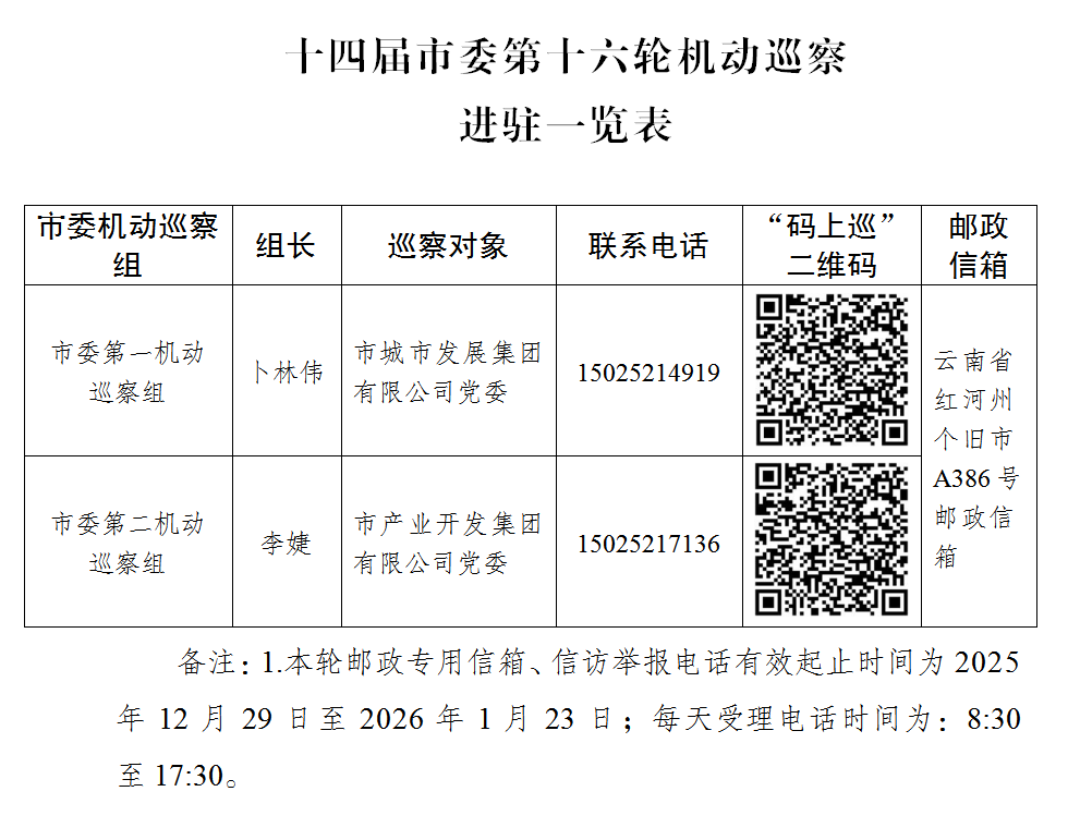 据悉,市委机动巡察组将在被巡察党组织工作30天左右,巡察期间设专门值班电话、邮政专用信箱,主要受理反映被巡察企业党组织领导班子及其成员、下一级党组织主要负责人和重点岗位人员问题的来信来电来访,重点是关于违反政治纪律、组织纪律、廉洁纪律、群众纪律、工作纪律和生活纪律等方面的举报和反映。市委机动巡察组受理信访时间截止2026年1月23日。