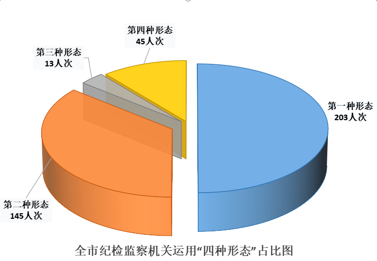 全市纪检监察机关运用监督执纪“四种形态”批评教育和处理406人次。其中,运用第一种形态批评教育和处理203人次,占总人次的50%;运用第二种形态处理145人次,占35.7%;运用第三种形态处理13人次,占3.2%;运用第四种形态处理45人次,占11.1%。