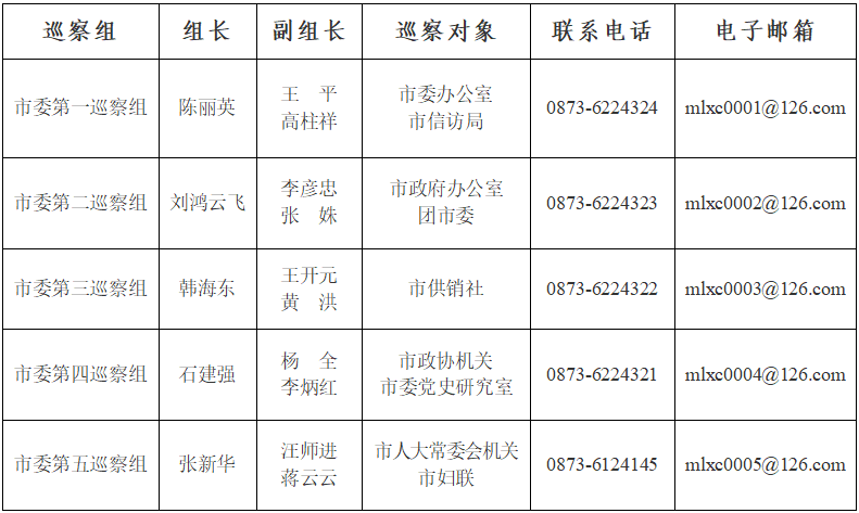 巡察期间,各巡察组开通受理信访举报电子邮箱、联系电话。根据有关规定,巡察组主要受理反映被巡察党组织领导班子及其成员、下一级党组织主要负责人和重点岗位人员问题的来信来电来访,重点是关于违反政治纪律、组织纪律、廉洁纪律、群众纪律、工作纪律和生活纪律等方面问题反映。其他不属于巡察受理范围的信访问题,将按规定转交被巡察单位和有关部门处理。市委巡察组受理信访时间截止到2024年8月2日。