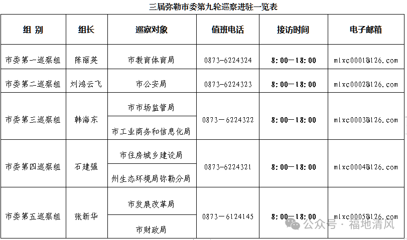 根据市委关于巡察工作统一部署,近日,三届市委第九轮巡察完成进驻。5个市委巡察组将分别对市教育体育局开展机动巡察,对市公安局开展常规巡察,对市市场监管局、市工业商务和信息化局、市住房城乡建设局、州生态环境局弥勒分局、市发展改革局、市财政局开展营商环境专项巡察。
