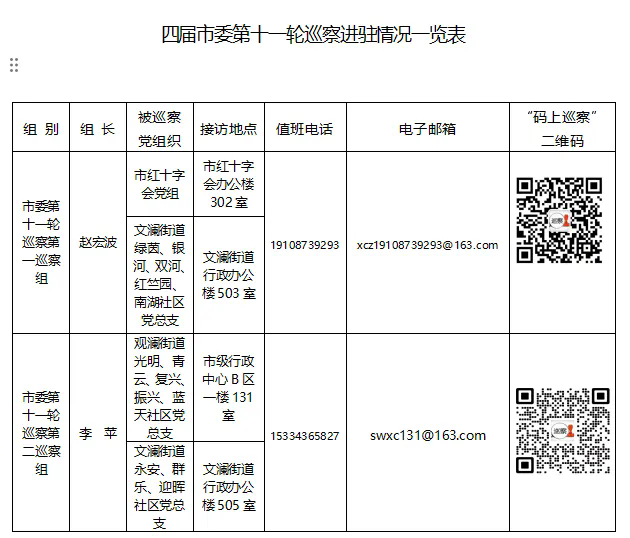 巡察期间设专门值班电话、电子邮箱、开通“码上巡察”二维码,主要受理反映被巡察党组织领导班子及其成员、重要关键岗位党员干部问题的来信来电来访,重点是关于违反政治纪律、组织纪律、廉洁纪律、群众纪律、工作纪律和生活纪律等方面的举报和反映。受理信访的时间为2024年9月20日至11月1日08:30至18:00。其他不属于巡察受理范围的信访问题,将按规定转有关部门认真处理,欢迎广大干部、群众向市委巡察组反映问题和情况。