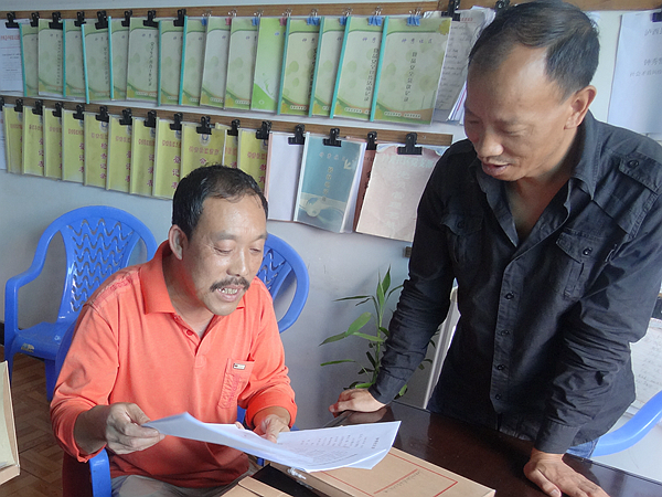 顾红旭(左)与同事讨论群众矛盾化解办法